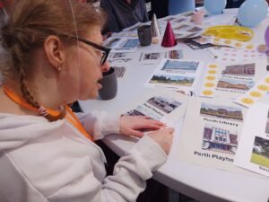 They were deciding on whether for them, places in Perth, such as Perth Theatre, The Concert Hall, The Museum, Perth Swimming Pool, the Parks ( North and South Inches) were deserving of 2, 3, or 4 or more stars. Members could also place a happy or sad face next to these places, or if they were able, to write out some detail or express to others, and the wider group via a microphone so they could be heard.